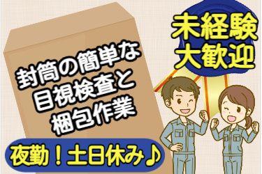夜勤/封筒の検査・梱包の軽作業!! 長期で安定の職場です 未経験者大歓迎/土・日休みが嬉しい職場