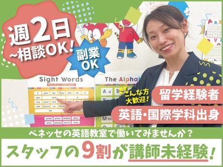仕事内容 【 * 英語力を活かして高収入×Wワーク * 】 〇火~土の15~19時の間で1日2、3時間~ 〇時給1850円~+レッスン手当1日1150円 〇「日常英会話」ができれば指導経験は不問 〇「本業が休みの日」など週2日~相談OK 〇仕事説明会あり!気になればぜひ応募を♪ / 英語系・国際系の学科で学んでいた! ワーキングホリデー・留学経験がある! 自分の英語力を活かして働きたい! \ そんな方歓迎!あなたの「英語力」を活かし 子どもたちの可能性を広げるお仕事です! ベネッセが開発したオリジナル教材を使用し 幼児~小学生のお子様を対象とした 英会話レッスンを担当していただきます。 【 * 具体的な仕事内容 * 】 ※全ての事務作業と生徒との基本的なコミュニケーションは日本語で行います。 All administrative tasks and basic communication with students will be conducted in Japanese. 〇英会話レッスン実施(メイン業務) 生徒の個性や理解度に合わせて 楽しくて効果的なレッスンを行います。 子どもたちの「英語を話したい!」を 引き出してみましょう! 〇保護者様とのコミュニケーション 送迎時の挨拶や専用アプリを通して 生徒の成長やレッスンの様子を伝えます。 〇体験レッスンおよび入会案内 お問い合わせがあった方に向けた 体験レッスンを実施。教室の魅力を伝えて 新しい生徒さんを迎えます。 〇教室運営サポート レッスン準備、教室の環境整備など。 ※教材費や生徒募集のための販促品費は 不要!当社ですべてご用意します。 【 * 英語指導デビューも安心 * 】 マニュアルを完備しているほか、 入社時に丁寧な研修をご用意しています! アクティビティやトーク例をベースに、 ご自身の強みを活かしたレッスンを 探しながら挑戦できます。 【 * Wワークする先生の1日(例) * 】 15:00 1つめのお仕事終了 16:00 教室到着!レッスン準備 16:30 レッスンスタート!小学生2コマ 18:30 レッスン終了 19:00 片付け、明日の準備をして退勤