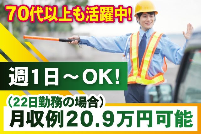 仕事内容 週1日~勤務可能なので ちょっとしたお小遣い稼ぎにも! 東金市にて 工事現場などでの交通誘導スタッフ大募集! 50代、60代、70代以上のスタッフ活躍中! 80代の方もご相談ください。 シニア世代で未経験の方が 多数スタートしています。 年金受給しながらセカンドキャリアとして 多くの方に選ばれてます。 フルタイムで働く方は月収20.9万円可能! <オススメPOINT> ・65歳以上・70歳以上活躍中 ・Wワーク(副業)OK ・日給保障有!(現場が早く終わっても安心) ・週1日~勤務OK ・女性スタッフも活躍中 ・毎日同じ場所で働くので安心! ・交通費全額支給!車(マイカー)通勤OK <仕事内容> 交通誘導警備員として、車の動きや 人の出入りを安全に誘導するお仕事です。 勤務地は、市川市近隣エリアとなります。 その他にも、千葉市中央区・浦安市・船橋市・ 習志野市エリア等もございますので お気軽にご相談ください。 基本的には、近隣エリアで就業できるように 配慮させていただきます。 1つの現場で固定のため、 他の現場への応援はありません。 毎日同じ場所で働くことができます。 ※直行直帰もOKです! 〈魅力の待遇〉 (1) 日給保障がありますので、 早く現場が終わっても安心です。 (2) シフトは自己申告制 週1日だけ働きたい…といった方から、 しっかり週5日働きたいといった方まで 多様な働き方ができるのが特徴です。 (3) 頑張るシニア世代を応援します。 60代以上の方で初めての方も多数活躍中! 同世代の仲間ができますよ。 当社は、ミドルシニア層の採用率が高めです。 (4) 直行直帰・車(マイカー)通勤OK (交通費全額支給) 現場への送迎もあります。 (5) 週払い制度 急な出費の際も週払い可能 (6) 丁寧な研修制度あり 無資格・未経験の方も現場へ配属される前に 事前研修と数日~2週間(日給保証)の 現場研修を行いますので 安心してお仕事を始めることができます。 2~3名のチームで作業しますので、 分からないことはすぐに聞ける環境ですよ。 <まずはお気軽にご応募ください> ・お問い合わせだけでもOK! ・入社時期も柔軟に対応いたします ・お電話でのご応募も受付中! TEL:043-441ー4670