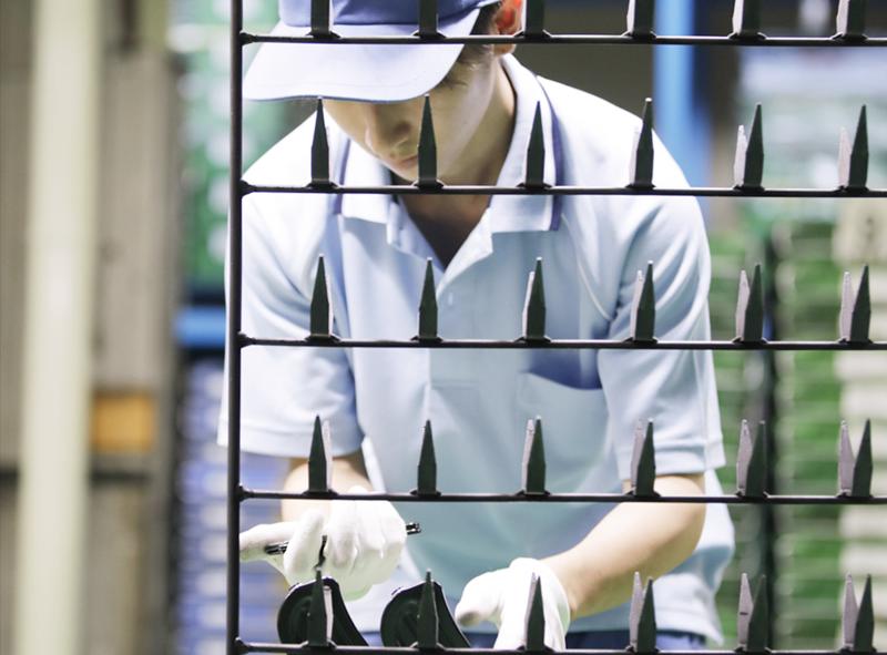 工場内での金属加工部品の目視検査スタッフ