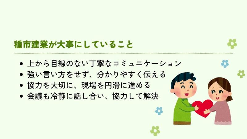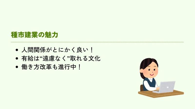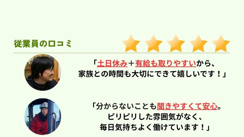 アピールポイント: ✅ なんでも話せる、心地よい職場です ・ガミガミ怒る上司はいません! ・ピリピリした雰囲気ゼロで、のびのび働ける ・現場では自然と声をかけ合い、チームワーク抜群 ・新人さんにも優しく、すぐに馴染めるあたたかい環境です ✅ 有給が「取りやすい」じゃなく「取るのが当たり前」 ・「休んで大丈夫かな…」なんて心配は不要 ・休みたいときに、しっかり休めます ・家族や趣味の時間も大切にできます ・社員全員が遠慮せず、有給を使ってリフレッシュ! ✅ 休みがしっかり取れるから、長く働ける ・現在、完全週休2日制(土日)へ移行中! ・年間休日125日+有給取得率80% ・業界でもトップクラスの働きやすさを実現 ・「働きすぎず、しっかり稼ぐ」理想の働き方が叶います 【スタッフの声】 35歳・男性(施工管理) 子どもの運動会や急な体調不良でも、有給が取りやすいので本当に助かっています。 「楽しんできて!」「お大事にね」と、周りのフォローや声かけもあたたかくて、気兼ねなく休めます。 前職では休みづらい空気がありましたが、今は子どもとサッカーする時間も増えて、家庭も大事にできています!