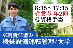 インフォメーション 急募≪土日祝休み≫資格手当・賞与年2回!あなたのボイラー・乙4資格を給与に直結させる設備管理 ~ 大学内でのお仕事です ~ 《群馬大学・昭和キャンパス》 資格と経験を活かして一緒に働きませんか? 大学内の機械設備管理の副責任者のお仕事です 日勤専属+土日祝休み! 長期歓迎・フルタイム歓迎・社会保険あり ボーナス・賞与あり(年2回)+資格手当あり 安定の社員登用制度あり ◎経験者歓迎・ご応募お待ちしております◎ アピールポイント ◎日勤・土日祝休み ◎賞与年2回 ◎資格手当あり ◎資格取得支援制度あり ◎正社員登用制度あり \ ご応募お待ちしております /