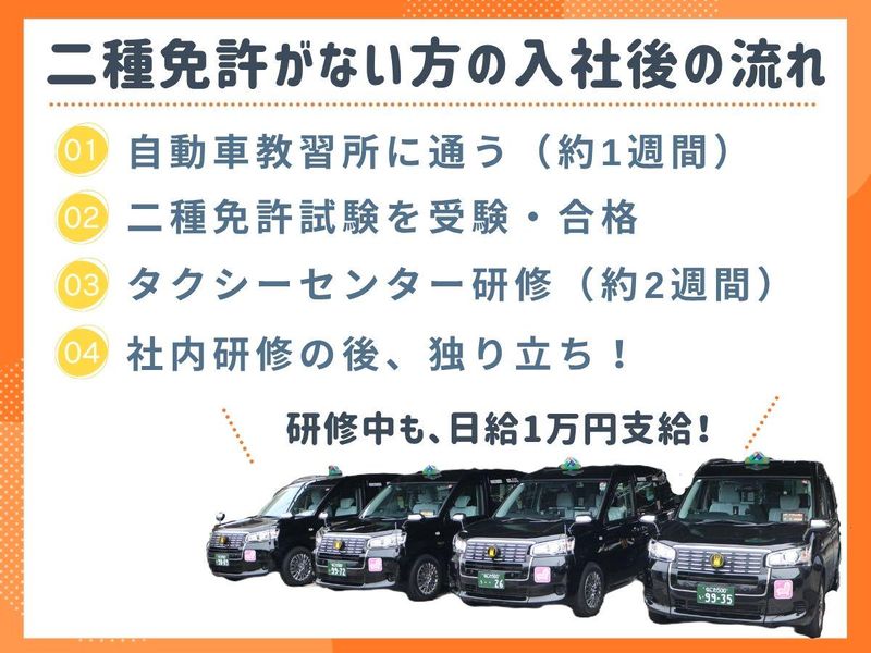求めている人材 【必須条件】 *普通自動車免許取得から3年経過した方(AT限定可) ┗二種免取得は全額会社負担します。 【下記当てはまる方是非◎】 *未経験OK *運転するのが好きな方 *地域密着のお仕事がしたい方 *細やかな気配りができる方 *接客も好きな方 *ライフステージも意識して長く働きたい方 今なら大阪の大型イベント開催中でタクシー利用も倍増! 稼げるチャンスです◎ 性別の条件と理由:女性歓迎(ポジティブアクション)