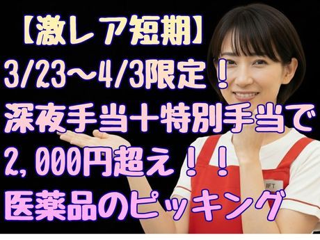 仕事内容 医薬品会社の冷暖房完備の倉庫で医薬品のピッキングなどをお願いします。 【お仕事の種類は、3つ】※いずれかに配属 ピッキング作業 ・医薬品を棚から探す ・探しだした医薬品を 小型の専用端末でバーコードをスキャンする 梱包 ・ベルトコンベアに検品済みの商品が流れてくる ・商品をプラスチックのケースにきれいに収納 積みかえ ・梱包された出荷前のケースを台車に積む 【この求人の魅力】 1.稼げる 特別手当がつき、さらに深夜手当もついちゃう! 2.未経験でも安心! コツコツ・モクモクルーチンワーク! 3.一年中快適な職場環境! 冷暖房完備! 食堂もあるので、安く美味しいご飯が食べられます。 【期間限定】 2026/3/23-4/3日迄 月曜日から金曜日の出勤 土曜日・日曜日はお休みです ダブルワークOK 【勤務後の悩み。相談する場所がない・・・ 】 ⇒そんな方こそぜひ派遣へ! 「派遣登録が初めてで不安・・・」 ⇒登録するorしないも含めて応募後に決めてOK! 派遣を通して仕事を決める場合、 現場の方と弊社派遣担当のどちらにも相談できます! ・不安を解消しやすい ・自分の意見を言いやすい といったメリットも! 【応募後の流れ・選考プロセス】 1.応募 ↓ 2.担当者より面接日程の調整等のご連絡をさせて頂きます ↓ 3.面談 (登録と面談含め1時間程度。詳細条件等をお伝えいたします) ↓ 4.採用決定のご連絡 ↓ 5.入社手続き等 ※ご応募~内定まで、平均1週間~1ヶ月程度になります ※在職中で今すぐの転職が難しい方も、調整のご相談が可能です