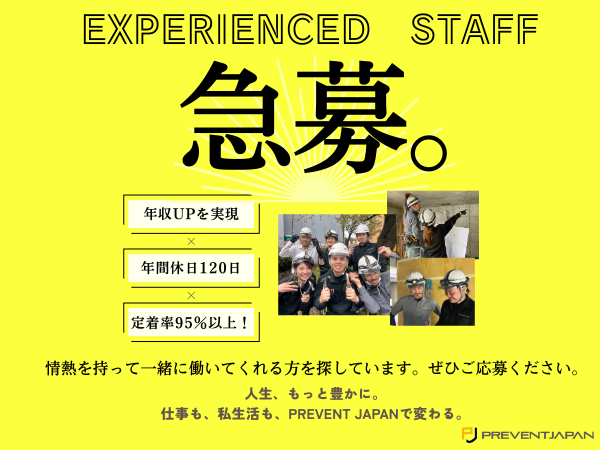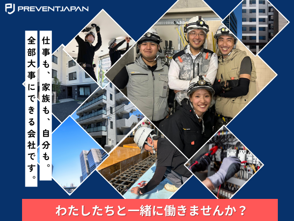 求めている人材 【必須条件】 下記をすべて満たす方 ★第二種電気工事士の資格をお持ちの方 ★新築物件の電気工事の経験をお持ちの方 ★普通自動車免許をお持ちの方(AT限定可) 【こんな方を歓迎します】 ■RC造・S造の集合住宅やオフィスビルにおける電気工事関係の仕事に就いた経験がある方 ■第一種電気工事士や2級・1級電気工事施工管理技士の資格をお持ちの方 ■ベンチャー企業ならではのスピード感で成長し、会社をつくっていきたい方 ■年功序列ではなく努力した分評価してもらいたい方 ■技術を身に付けたい方 ■主体的に考え、行動しようとする方 ■メリハリを付けて働きたい方 - 電気設備工事 職長よりメッセージ - PREVENT JAPANに中途入社して1年1か月になります。 ベンチャー企業で年齢や経験年数に関係なく評価されることもあり、 23歳ですが職長を任されています。 私がPREVENT JAPANに入社を決めたのは写真で社員の方達がフレンドリーに見えたこと。 面接官の人柄もよく写真通りと思い入社しました。 実際に入社しても皆さん優しく毎日気持ちよく仕事ができています。 また手当も充実していて他社に比べて給与が高かったこと、たまに休日出勤もありますが 振替休日があるので休みもしっかり取れてプライベートも充実できることも決め手になりました。 その日の仕事が早く終えたら13時以降に帰宅できる日もあります。 ベンチャー企業ならではの働きやすい社風です。 最初は私がしっかり仕事を教えますので安心してご応募ください! 職長 永石 23歳 - 建設事業本部 部長よりメッセージ - こんにちは! 当社は設立が令和2年とまだまだ新しい会社です。 私は元々車のディーラーや電力削減の 営業をしており建築の仕事とは無縁でしたが、 弊社代表取締役の臼井から声をかけていただき PREVENT JAPANに入社しました。 施工管理もやった事がない状態で建築の電気工事部門を立上げ、 下請けさんに色々と協力してもらって現場を収めていましたが、 徐々に助けてくれるメンバー(社員)が増えていき 年々 人も 売上も倍増していきました。 電気管理だけ行っていましたが、途中で自社施工する方針へ 転換をし、人もある程度増えた今ではメンバーが率先して 現場を収めてくれており、部門立上げ4年目で 売上10億に届く勢いとなりました。 いつもいつも助けられている毎日です。 働く上で作業を共にするメンバーとの絆や完工時の達成感は 大切ですが、それに応じた収入がなければ 仕事を頑張る活力にはならないですよね。 実際に年収モデルのように 入社が浅くてもその方の経験や また業績に応じてしっかりと還元していきます。 請負案件の話が尽きる事はなく、 まだまだ施工メンバーが足りません!! 今回の募集で7名以上職人さんを採用したいと思っております。 是非、あなたのお力を当社で活かしていただけないでしょうか? 建築事業部一同お待ちしております。 建設事業本部 部長 大越