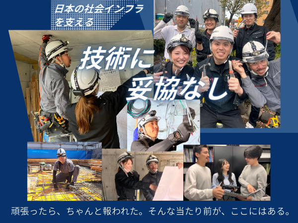 【保険制度】 雇用保険、労災保険、健康保険、厚生年金 待遇・福利厚生 【福利厚生】 ■社会保険完備(雇用・労災・健康・厚生年金) ■交通費全額支給 ■役職手当(月1万円~20万円) ■資格手当(対象の資格:第二種電気工事士・第一種電気工事士・電気工事施工管理技士 各 月25,000円) ■健康診断 ■インフルエンザ予防接種 ■資格取得支援制度(受験費用を2回まで会社が負担) ■研修制度 ■社内食事会 ■社用着・工具貸与 ■入社祝い金10万円支給(入社3ヶ月後の支給) ■U・Iターン支援あり(上京支援金10万円支給/1都3県以外からお引越しされる方限定) ■リフレッシュ休暇、リフレッシュ手当(勤続年数3年以上の社員が対象) ■夏季健康サポート手当(工事現場メンバーが対象、7~9月は熱中症対策の為5,000円支給) ■社内サークル制度 ■里帰り補助制度 ■ウェルカムランチ制度 ■キッズ在宅 ■からだメンテ制度 ■フィットネスdeケア ■プロ野球観戦チケット付与 <職長以上は下記を全て貸与> ■社用携帯・ノートPC ■社用車 ■ガソリンカード・ETCカード・タイムズPカード