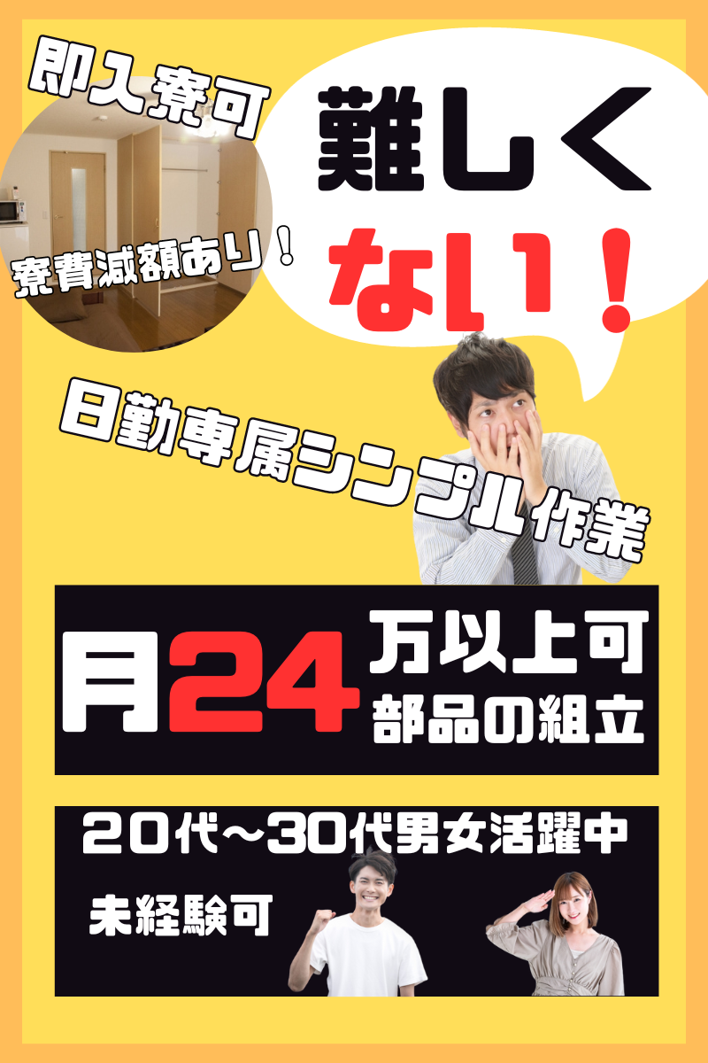 仕事内容 <ここがポイント!> ・コツコツ系のシンプル業務 ・未経験スタートの先輩多数! ・丁寧な教育研修ありで安心 ・日勤のみで働きやすさも◎ ・正社員登用制度もあります! 車の内装部品を製造する 工場での作業です。 未経験でもすぐに覚えられる 初心者向けのシンプル業務! 初めて&お久しぶりに 工場作業をする人にオススメです♪ - <主な業務> ■マシンオペレーター 機械に材料を投入し、 ボタンを押すだけの簡単作業♪ ■バリ取り 加工された製品の余分な箇所を ハサミで取り除くコツコツ作業♪ ■検査 製品完成後、傷や変形がないかを 目視でチェックしていきます。 ▼入社後は… 丁寧な教育研修を行っています! 基本的な仕事の流れからポイントまで しっかりと学んだ上で始められます♪ エヌエス・テックのスタッフも 継続的にサポートしていくほか、 ほぼ毎日スタッフが工場に顔を出すので、 気になることがあれば何でもご相談を! あなたが安心して働けるように 私たちが精一杯サポートします! <仕事のポイント> 一度覚えてしまえば サクサク業務が進んでいく シンプル工場作業です♪ 一つの作業に集中できるので、 「ストレスフリーで働きやすい」 なんて声も上がってきています◎ しかも土日休み&日勤なので、 まわりと予定を合わせやすく、 イベントごとにも気軽に参加可能。 公私ともに充実できますよ♪ ▼先輩たちは… 20代・30代・40代(45歳以下)の 世代の男性が活躍しています! 住みたい町ランキング上位の 大阪の箕面市内に寮があり、 家具・家電付きで寮費も格安♪ Wi-fi付きのワンルームタイプで、 住みやすいと好評を受けています。