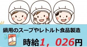 募集背景 業務増加による増員 仕事内容 ◆◇◆◇◆◇◆◇◆◇◆◇◆◇◆◇◆◇◆◇ 【鍋用スープやレトルト食品を製造するお仕事です。】 ■スープ製造 ・計量された材料を機械に投入する作業 ■充填作業 ・コンベアーから流れてきた製品をトレイに乗せて他の工程に運ぶ作業 ■箱詰め作業 ・小分けされたパック製品を箱詰めする作業 ※上記いずれかの配属先となります。 ◆◇◆◇◆◇◆◇◆◇◆◇◆◇◆◇◆◇◆◇ ■細かい作業、難しい作業は一切無し♪ ■スーパーなどで見かけるチルド製品です♪ ■直接触らないから匂いは気にならない♪ ◆◇◆◇◆◇◆◇◆◇◆◇◆◇◆◇◆◇◆◇ ■工場見学をして頂いて実際の作業現場を見て頂くことも可能です。 食品会社での経験がある方はもちろん未経験の方にもオススメです。 未経験でも【チャレンジしたい】向上心ある方、大歓迎です♪ まずはお気軽のご応募ください♪♪ ◆◇◆◇◆◇◆◇◆◇◆◇◆◇◆◇◆◇◆◇ [醍醐味] 私たちの生活に欠かせない「食品」を扱うお仕事です。 [厳しさ] [こんな人が活躍] ■20代~50代まで幅広く活躍中です♪ ■モクモク作業がお好きな方♪