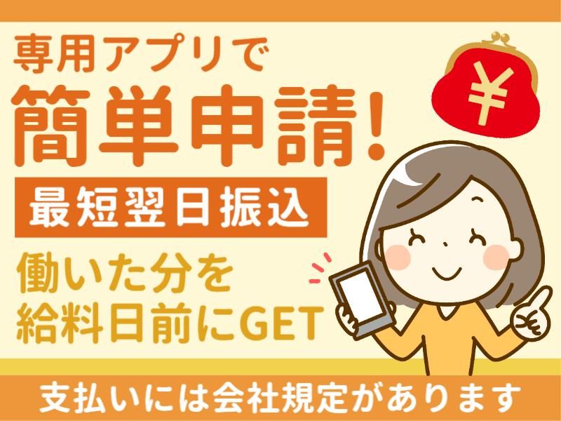 【保険制度】 雇用保険、労災保険、健康保険、厚生年金 待遇・福利厚生 【福利厚生】 社会保険完備 交通費規定支給(上限/月3万円) 有給休暇 資格取得支援制有(規定) 制服貸与 マスク・耳栓会社支給 車通勤OK 敷地内無料駐車場完備 住宅手配可 ⇒入社2・3週間後から入居可能 赴任費支給(規定) 正社員登用制度あり 髪色自由!マツエクOK 社員食堂あり 食堂の隣に喫煙所あり お弁当の注文OK(430円程度/1食) 【稼働分前払い制度あり(規定)】 専用アプリで簡単申請!最短、翌日振込可! 「急な出費」など、活用しているスタッフ多数!
