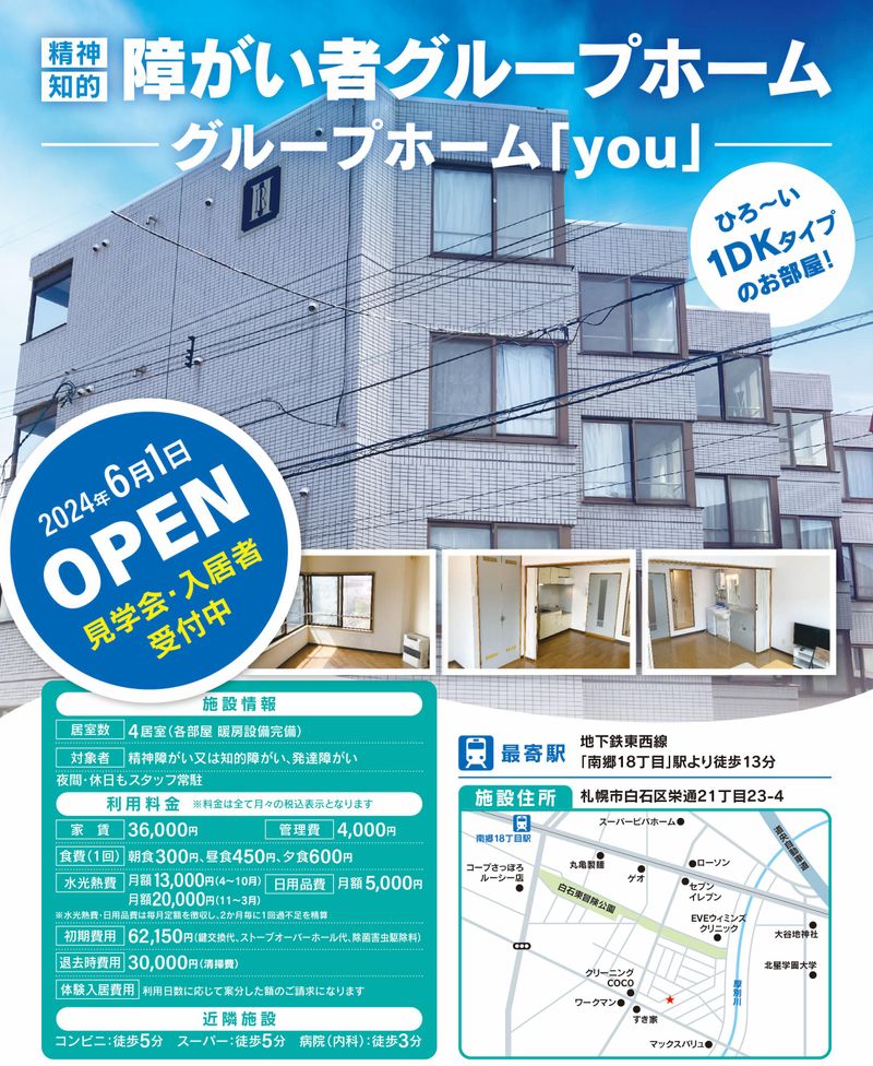 選考プロセス 一次面接後、合否をお伝えいたします。 【面接地・登録地】 障がい者グループホーム you 所在地:北海道札幌市白石区栄通21丁目23-4-205号 担当者:坂本 裕太 電話番号:09059524678 メールアドレス:cisco.club202308@gmail.com