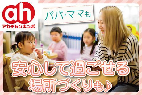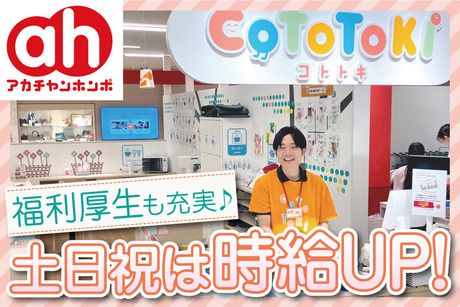 資格 ・土日祝勤務できる方歓迎(いずれかでもOK) ・継続して1年以上勤務が可能な方 ・研修カリキュラム充実!未経験でも問題なし! ・フリーター、主婦(主夫)活躍中 ・既存店では20代、30代中心に活躍中 ・学歴不問 ・お仕事復帰、ブランク応援 ・職種未経験、業界未経験歓迎 ・社会人未経験、第二新卒歓迎 ・フリーターから正社員を目指す、そんな働き方も可能です♪ ・女性活躍中! <下記にあてはまる方歓迎!> ・子どもと接するのが好きな方 ・子どもと関わる仕事がしたい方 ・保育士や幼稚園教諭、教育関連職種の資格や経験がある方 ・丁寧、親切なコミュニケーションを図ることが出来る方 ・身体を動かすことが好きな方 ・あそびを通して子どもや子育てをしている方々を サポート、支援する、社会貢献に興味がある方 【アカチャンホンポとは】 マタニティ用品、出産準備用品、育児用品をはじめとした商品を 豊富に品揃えする、マタニティ・ベビー・キッズ用品専門店。 また、総合的な子育て総合支援企業を目指し、 子育て支援サービスにも力を入れています。