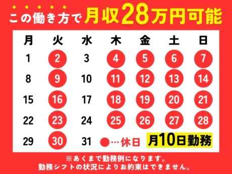 休日 ◆希望に合わせて働き方の相談が可能です 「土日祝のみ」「平日のみ」などもOK まずはお気軽にご相談くださいね! <スタッフを第一に> 施設内は冷房完備で、 快適に働ける環境です! ※業務によっては、 冷房のない場合もあります。 巡回などの業務もあるため、 熱中症対策に注力しています。 ・塩分タブレットの支給 ・こまめな休憩を実施し、負担を軽減