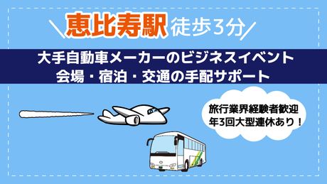 仕事内容 ★自動車メーカーのビジネスイベントの 会場や宿泊・交通の手配をお願いします★ ≪主な業務内容≫ ◎表彰式や会議などグループ企業のイベント会場手配・調整 ◎参加者の宿泊先手配・調整 ◎参加者の交通手段(バス・航空券・新幹線等)の手配・調整 ◎メール、電話対応(基本はメールでのやり取り) ◎その他付随する業務等 ●周辺環境● ・恵比寿駅から徒歩3分の好立地! ・ビル内にカフェ・社員食堂あり! ・周辺もランチエリア充実 ■月収例■ 280,000円 + 交通費 (時給1,750円x8時間x20日勤務の場合) ★ポイント★ ・12/1から就業開始!(開始日相談OK) ・駅チカ:恵比寿駅徒歩3分 ・土日休み ・GW、お盆、年末年始に大型連休あり! ・オフィスカジュアルでネイル、ピアスもOK! ・交通費全額支給あり ※当社:阪急交通社100%出資会社 阪急阪神ホールディングスグループの一員です ☆WEB面接実施中☆