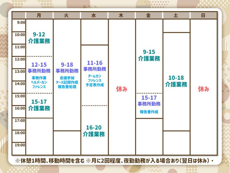 勤務時間詳細 総労働時間:1ヶ月あたり171時間 変形労働時間制 月30日の場合:171時間 月31日の場合:177時間 <シフト例> 10:00~19:00(1日実働8時間) 19:00~翌9:00(待機時間を休憩とする) など