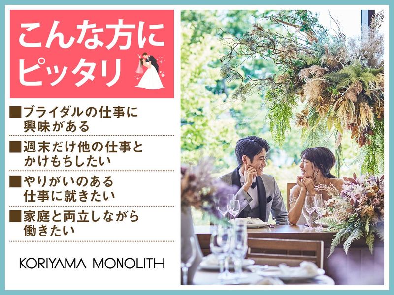 求めている人材 ★主夫・主婦歓迎 ★扶養内勤務歓迎 飲食店やカフェ、居酒屋など… サービス業でのアルバイト・パート経験が無くてもOK! ブライダルといっても 学生スタッフも活躍している職場なので、 堅く考える必要はありません◎ まずは 「言われた場所に料理を運ぶ」 「下げてと言われたお皿を下げる」 この程度のことができれば全く問題ナシ★ 1営業日で社員15名+アルバイト6名体制なので安心! 「土日にWワーク希望」 「ブランクがあるけど育児が一段落したから働き始めたい」 「パート主婦として家計の収入の足しにしたい」 「非日常的な空間でリフレッシュしながら働きたい」 など大歓迎! ◇未経験者歓迎 ◇無資格歓迎 ◇フリーター歓迎 ◇Wワーク歓迎 ◇学歴不問 ◇高校生ok