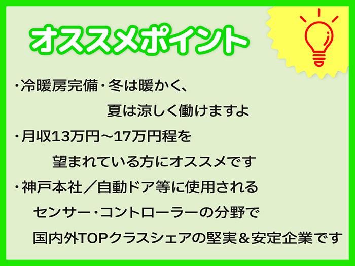 仕事内容 「電子機器組立補助」と「製品チェック(検査補助)」を担当します。シンプルな軽作業なので、初心者の方でも入って1週間くらいで慣れてもらえると思いますので、このお仕事が初めての方でも安心してご応募ください。また作業手順などもあなたの覚えるスピードに合わせて丁寧にお教えします。勤務曜日は(月)~(金)、平日のみなので祝日はお休みになります。それと勤務時間は9:00~17:15(実働7時間30分・休憩45分)。基本この時間帯で実働7時間30分での勤務ですが、「実働6時間位」が前提での、9:30開始・10時開始などスタート時刻の多少の相談や、15:45終了・16:15終了など終了時刻の多少の相談も可能です。 【具体的には…】 マニュアルに沿った、そしてシンプルで身体への負担が少ない軽作業のお仕事です。重いものや危険な作業は伴わないので、未経験の方でもマニュアル通りに作業ができますよ。 ● 電子機器組立補助 ・製品に使用する部品の仕分け・準備(ねじ・ハーネス・基板等のセット) ・簡単な組付け作業(ネジ締め、コネクタ接続、ラベル貼付など) ・ユニットのケース組付け補助や作業台への部品セット ※未経験の方でも作業しやすい、シンプルな軽作業が中心です。 ● 製品チェック(検査補助) ・外観検査(キズ、汚れ、はんだ状態、部品の取付状態などの確認) ・通電しての基本動作チェック(LED点灯、スイッチ反応など) ・検査結果のチェックシート記入、合格品の簡易梱包作業 ※専門知識は不要で、丁寧さ・正確さがあれば対応いただける内容です。 【旭光電機 明石工場ではこのような製品を作っています】 ■駅のホームドア用のセンサー・コントローラー ■電車のブレーキコントローラー ■大型船舶の電子制御機器 ■ビールサーバー用周辺機器 など 【お仕事PICK UP!】 女性スタッフ多数活躍中 経験不問・未経験者大歓迎 駅チカ・バイク通勤&自転車通勤OK 空調完備/快適な工場です (月)~(金) 基本週5日のお仕事 実働6時間位での勤務時間帯の相談可
