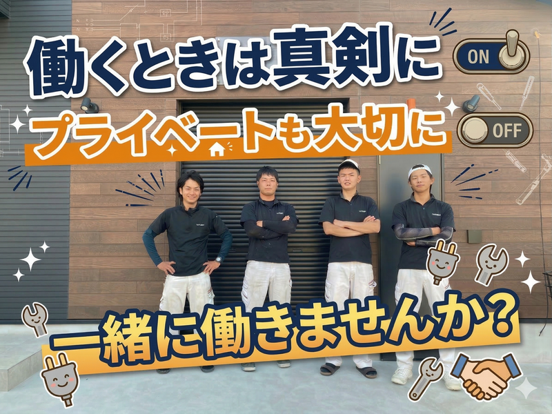 仕事内容 ╭━━━━━━━━━━━━━━━━━╮ 日本語でコミュニケーションが 取れる方、大歓迎! ╰━━━━━━━━v━━━━━━━━╯ 当社は2020年設立の電気設備工事会社。 設立間もない会社ですが、 大手との取引が多数あり、 安定した依頼をいただいています。 業績は右肩上がりで成長中! 現在は人手が足りず、 お断りしている案件もあるため、 会社の成長を一緒に支える 新しい仲間を募集します! 経験や資格は一切不問◎ 「稼ぎたい」 「手に職をつけたい」 そんな気持ちがあれば大歓迎です♪ ✅近畿エリアの建物で電気設備工事を行う  ̄ ̄V ̄ ̄ ̄ ̄ ̄ ̄ ̄ ̄ ̄ ̄ ̄ ̄ ̄ ̄ ̄ ̄ ̄ 具体的には… ・照明・スイッチ・コンセントの設置 ・電源ケーブルや配線工事 ・エアコンなど空調設備の設置 ・既存建物の電気設備改修 ・ビルや施設の電気設備メンテナンス 建物に電気を通して、 生活や仕事に欠かせない インフラを支える仕事です。 将来もなくならない 安定した技術が身につきます。 ✅工事を行う建物  ̄ ̄V ̄ ̄ ̄ ̄ ̄ ̄ ・大型商業施設 ・オフィスビル ・国立病院 ・各種公共施設 など 普段は入れない建物の裏側を見る 機会もあり、スケールの大きな 仕事に関われます。 ✅働く環境  ̄ ̄V ̄ ̄ ̄ ・エリア:近畿一円 (主に大阪府内) ・移動:社用車で現場へ移動 ・ほとんどが日帰り案件 ・18時半には帰社することが多いです 社員と協力会社のスタッフを含め、 約10名のチームで作業します。 チームで仕事を進めるため、 コミュニケーションを 大切にできる方を歓迎します! ✅未経験でも安心✨  ̄ ̄V ̄ ̄ ̄ ̄ ̄ ̄ ̄ 現在働いているスタッフも 未経験スタートが多数! 入社後は先輩と一緒に現場へ行き、 少しずつ仕事を覚えていきます。 最初は… ・工具の使い方 ・図面の見方 ・電線を引く簡単な作業 など基礎から丁寧に教えます。 「電気はこう配線されているのか」 と仕組みがわかると、 仕事がどんどん面白くなります♪ ✅資格取得を会社が応援!  ̄ ̄V ̄ ̄ ̄ ̄ ̄ ̄ ̄ ̄ ̄ ̄ 資格取得支援制度あり。 (講習・資格代を会社全額負担) 電気工事士などの資格を取り、 一生使える技術を 身につけることができます。 手に職をつけて 長く安定して働きたい方には 最適な環境です◎ 「興味がある」 「何か仕事を始めたい」 そんなきっかけでも大歓迎です! 経験・資格は不問! 手に職をつけたい方を歓迎します♪