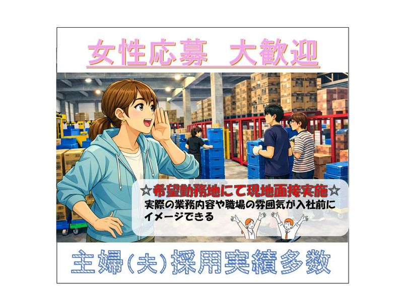 仕事内容 ⋄✧⋄⋆⋅⋆⋄✧⋄⋆⋅⋆⋄✧⋄⋆⋅⋆⋄✧⋄ \週4日以上×平日のみ!/ 清涼飲料水の仕分けスタッフ ☆リーダー候補を募集中☆ ⋄✧⋄⋆⋅⋆⋄✧⋄⋆⋅⋆⋄✧⋄⋆⋅⋆⋄✧⋄ \腰の負担もナシ♪/ 倉庫内での清涼飲料水の仕分け・ ピッキング作業をお願いします。 ペットボトル飲料を1本ずつ専用の箱に入れるだけ! 高さ調整のできる台車があるので、 腰への負担も心配ありません◎ 今回は上記に加えて、リーダー業務を お任せします!メンバーと同様に 上記の仕分け/ピッキング作業を 行いながら、当社メンバー全体への指示出し(作業の割り振り・声かけ等)をお願いします。 男性・女性ともに活躍中! 繰り返し作業が中心なので、未経験の方でも すぐ慣れていただけます★ 学生さん・主婦さん・シニアの方も活躍中✨ 幅広い世代が働きやすい職場です♪ 「コツコツ作業が好き」 そんな方にピッタリのお仕事です◎ ◆1日の流れ(リーダー業務あり)  ̄ ̄ ̄ ̄ ̄ ̄ ̄ ̄ ̄ ̄ ̄ ̄ ̄ ̄ ̄ 出社して勤務開始 (天候に左右されない屋内作業) ↓ 当日の作業内容を確認し、 当社メンバーへ指示出し ↓ 飲料水を1本ずつ箱詰め (台車ありで安心♪) ※リーダーも作業に入りながら全体の進捗をチェック ↓ お昼休憩 ↓ 午後の作業スタート (進み具合を見て声かけ・調整・フォロー) ↓ 作業終了!片付け・最終確認/翌日の準備共有 (残業ほぼなし) ◆勤務条件  ̄ ̄ ̄ ̄ ̄ ̄ ・8:30~17:30(実働8時間/休憩60分) ・週4日以上 ・平日のみ ・残業基本なし◎ ◆給与  ̄ ̄ ̄ ̄ 時給1450円~(別途交通費支給) \こんな方にピッタリ✨/ ✅ コツコツ作業が得意な方 ✅ 平日のみ働きたい方 ✅ 腰への負担が少ない軽作業を 探している方 ✅ 未経験から安心して始めたい方 ◆会社について  ̄ ̄ ̄ ̄ ̄ ̄ ̄ ̄ 当社は創業60年以上のマルノウチグループの一員。 大手飲料メーカーとの取引をはじめ、 300名を超えるスタッフが活躍中です。 「ここで働いていてよかった」 と思っていただけるように、 安心して働ける環境づくりに力を入れています。 気になった方はぜひお気軽にご応募ください♪ あなたと一緒に働ける日を楽しみにしています◎