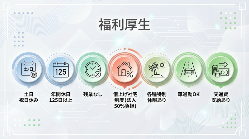 勤務時間・曜日: 8:30~17:30(休憩60分) ※時間外勤務実績 平均5時間/月 完全週休2日制 土日祝日休み