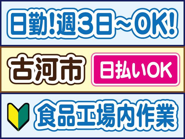 【履歴書不要・日払いOK】 急募!食品工場内作業! 未経験OK!日勤・土日休み!週3日~勤務OK!