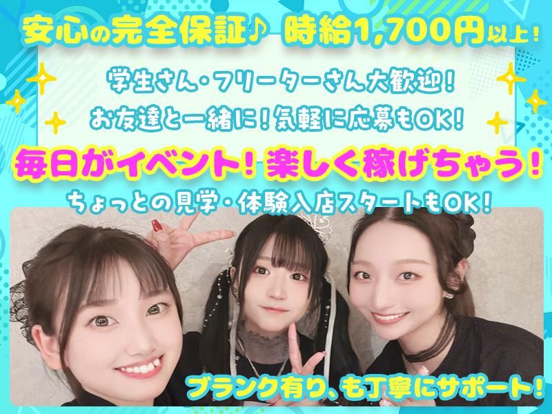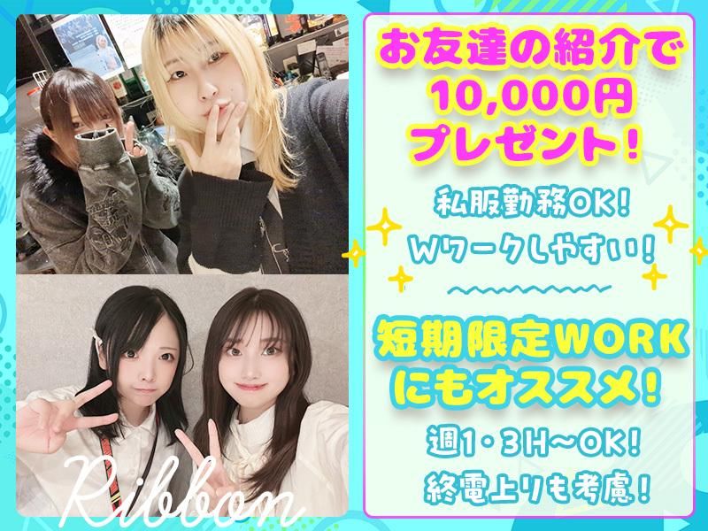 仕事内容 ・。・。・。・。 カフェバーリボン ・。・。・。・。 かわいい衣装が特徴の ユル~く働ける癒し系店舗です♪ 現在は10代~20代のstaffが 中心に活躍中! ――春向けて稼ぎたい方歓迎―― ▼▼▼ \春に向けて/ 飲み会・旅行・テーマパーク・お祭り! 今からお小遣いを稼いで 最高のバケーションを実現しませんか♪ ☆春休みまでの短期もOK! ☆長期で働きたい方も歓迎(*^^*) ――未経験でも大丈夫?―― ▼▼▼ 入店後は先輩が丁寧に お仕事をレクチャー♪ みんな未経験からのスタートだから スグに馴染んでいただけるはず! 接客はカウンター越し& 連絡先交換や営業行為なども一切ナシ! ――プライベート最優先でもOK?―― ▼▼▼ もちろんです♪ 週1日~・シフトも柔軟! 空き時間を有効活用して、 好きなときだけマイペースに働けます★ ▼▼▼ スタッフみんな仲が良く、 毎日楽しく過ごしてます! ストレスフリーなお店で、 一緒にお仕事してみませんか♪ ★――――――★ どんなことをするの? ★――――――★ 「カフェバーって行ったことないし、 よくわからない…(;・∀・)」 そんな方も全然大丈夫♪ やる事と言ったら簡単なドリンクづくりや 楽しくおしゃべりするだけ! 趣味やアニメの話などで 盛り上がることが多めです♪ お客様と一緒に カラオケで楽しむことも! ★――――――★ どんな衣装で働くの? ★――――――★ たくさんの衣装から 好みや気分に合わせて コーディネート出来ちゃいます! ※私服勤務もOK!