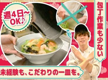 求めている人材 【必須条件】 *週4日以上、1日6〜8時間勤務が可能な方 *ランチシフト・ディナーシフトどちらも勤務可能な方 >シフト希望は毎週提出可能なため、希望はお気軽にご相談ください <<上記に該当する方であれば・・・>> *フリーターさん大歓迎! *主婦(夫)パートさん活躍中!子育てが落ち着いた方などもぜひ! *正社員希望の方も大歓迎(正社員登用制度有) *中華料理が好きな方大歓迎!(まかない無料) <下記に該当する方もぜひ!> *和食や洋食、イタリアンなど別ジャンルの調理経験者 *カフェやファミレス、ラーメン店など別業態の経験者