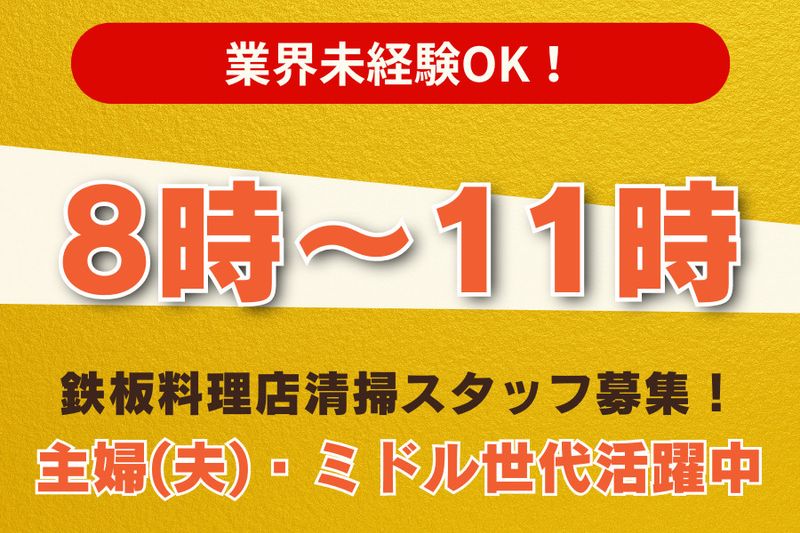 【仕事内容】 \鉄板料理店清掃スタッフパート大募集/ 【仕事内容】 床の清掃 窓ガラスの清掃 トイレの清掃等 ✅ご家庭のお掃除の延長でOK ✅空調の効いた屋内勤務がメイン ✅安心の研修制度 ✨長期間働ける方を募集しています ※面接時、簡単な適性検査有り 【求人ID-A0018-1】