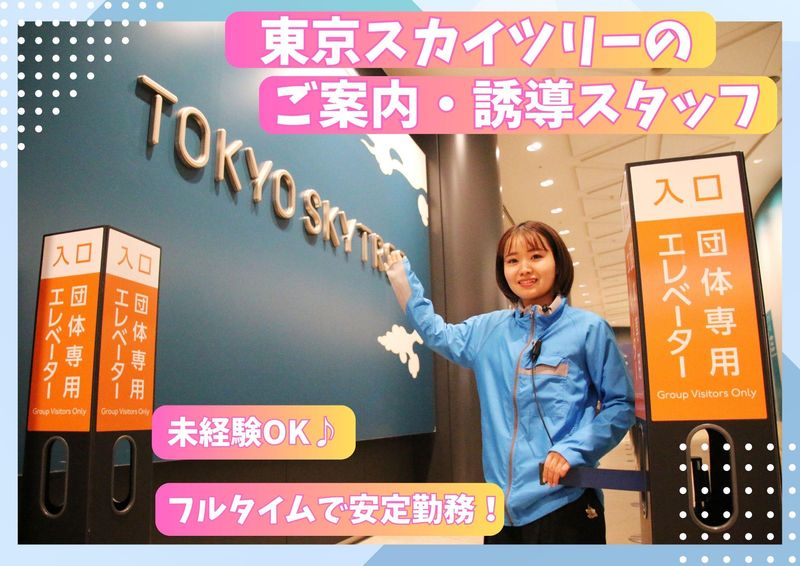 仕事内容 日本を代表する施設「東京スカイツリー」の 団体フロア運営スタッフを募集! 友達や家族にちょっと自慢できる、 めずらしいお仕事です! 東京スカイツリー団体フロアには、 全国から修学旅行生や、 海外からの団体旅行客の方々など 様々なお客さまがいらっしゃいます。 そんな皆さまを 東京スカイツリー展望台にご案内! 皆さまの想い出を作る、 とてもやりがいのあるお仕事です。 - <仕事内容> ・観光バスの案内誘導 ・団体のお客さまの案内誘導 ・チケットカウンターにて団体チケット発券 ・その他、接客業務 「難しそう」と思われるかもしれませんが、 先輩達も皆未経験からのスタート。 しっかり研修を行うので、ご安心ください。 - <メリハリのある仕事です!> 団体のお客さまの多い時間帯については 他スタッフ共に連携を取りながら、 テキパキ誘導案内を行いますが 団体さまの少ない時間帯は、 自分のペースで個人のお客様への 館内案内を丁寧にお願いします。 - 「人と関わることが好き」 「自分の接客で喜んで欲しい」 そんな人にピッタリのお仕事です。 とは言っても、接客経験は不問! 仕事を通してスキルを身につけられます♪ - ここでしか経験のできないお仕事です。 東京スカイツリーの顔として、 お客さまの「想い出」に残る 笑顔とお客様対応で おもてなししましょう! -