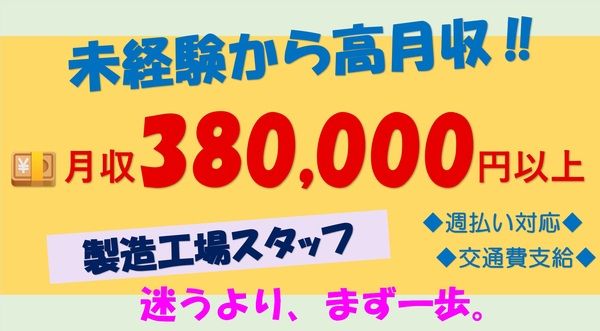 未経験から月収38万円以上!◆月収例383,482円+交通費 ◆工場スタッフ◆資格必要なし