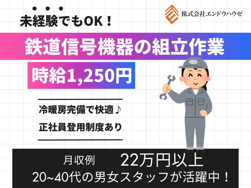 仕事内容 ★おすすめポイント★ ✅ 安定企業ではたらく安心感 大手メーカーのグループ企業だから、長く安定して働けます! ✅ 日勤&土日祝休み! 夜勤なし&カレンダー通りのお休みで、プライベートの予定も立てやすい◎ ✅ 空調完備&キレイな職場 快適な環境で働けるから、作業に集中できます♪ ✅ 正社員登用のチャンスも! 「将来的に安定したい」という方にもおすすめです! ✅ 20〜30代の男女スタッフ活躍中 同世代が多い職場で、はじめての方もなじみやすい雰囲気です! ★お仕事内容★ \信号機器メーカーのグループ企業で安定勤務/ 自動車・鉄道向け信号機器を製造する工場での【組立スタッフ】募集! 「コツコツ作業が好き」「モノづくりに関わりたい」そんな方にオススメ! ◆信号機器の組立・製造作業◆ 大手信号機器メーカーのグループ企業での勤務となります。 【具体的には…】 ▶電動ドライバー・インパクトドライバーを使ったネジ締め ▶ゴムパッキン等の小物部品の取り付け さ製品の外観チェックなどの軽作業 ※未経験の方も、作業手順は丁寧に教えますので安心してスタートできます!