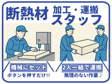 お仕事内容 \ 住宅などに使われる“断熱材”をつくるお仕事です! / 50代~60代前半の男性スタッフが多数活躍中 未経験でも始めやすい軽作業です! お仕事内容はとってもシンプル! ・カット作業 → 素材を機械にセットしてボタンを押すだけ!自動で断熱材をカットします。 製品の運搬 → カットされた製品(約5kg)を2人1組で運搬。無理なくできる作業です〇 ・ 基本的にペア作業なので、困ったときもすぐ相談できます! ・ 汚れる作業でも安心!シャワー室完備でスッキリ帰宅♪ =====ここがポイント===== ■未経験で出来る工場のお仕事! ■完全日勤のみ、残業なし! ■土日祝休みでプライベート充実! ■50代から60代前半の男性が多数活躍しています! <アピールポイント> ・高時給 ・日勤専門のみ ・土日祝お休み ・残業無し ・弊社独自の福利厚生の充実、会社負担で医療保険に加入 私傷病での入院費用は会社負担の保険加入でお任せ。 いざという時の病気にも対応。 <その他> ・作業服貸与 ・食堂完備(お弁当注文可) ・更衣室、シャワー室完備 ・マイカー・バイク・自転車通勤OK ・転職したい方 ・喫煙所完備 まずはお気軽にご相談ください! 転職したい方、就活中の方、ぜひご応募ください。