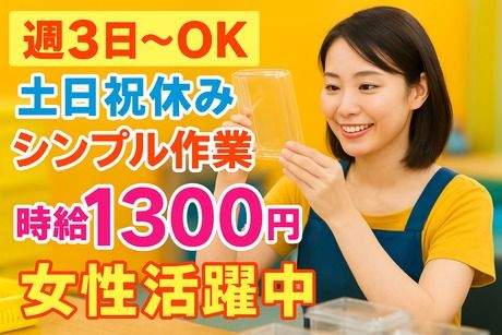仕事内容 シンプル作業で安心♪未経験者も積極採用中! <お仕事内容> プラスチックケースなど、 身近なパッケージ製品を製造・販売しているメーカーでのお仕事です。 扱うのは軽量な部材ばかりなので、体への負担も少なく、 工場ワークが初めての方も安心してスタートできます♪ 主な作業内容はコツコツできるシンプルワーク! 部材をセットしてカンタンな組立を行い、 キズや汚れがないか目視でチェック。 専用機械で仕上げ加工をした後、 商品を入れる箱を組み立て、 完成品を丁寧に梱包するお仕事です。 どの工程もマニュアルが整っており、 未経験の方でもすぐに慣れていただけます。 一つひとつの作業に集中できるので、 「モクモク作業が好き」「自分のペースで働きたい」という方にピッタリ! あなたに合った働き方が選べます♪ ★時給1,300円! 無理なく稼げる安心の高時給 ★週3日~OK! 家事や育児との両立にも最適♪子育て中の方も勤務時間の相談に乗りますので遠慮なくおっしゃってくださいね。 ★もちろんフルタイムでがっつりもOK! ★土日祝休み! プライベートの予定も立てやすい ★未経験大歓迎! 充実した研修とサポート体制あり