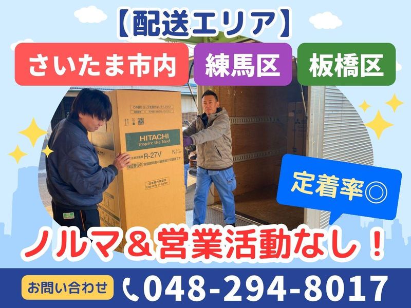 仕事内容 ══════════════════ ✅未経験OK◎ ✅ノルマ&営業活動なし!定着率◎ ✅昇給・賞与あり!頑張りを還元♪ ✅2人1組で安心作業!ミドル活躍中! ✅日勤のみ!夜間配送はなし♪ ══════════════════ 《業務内容》 2tトラックにて家電の配送と お客様宅への設置をお任せ! ※バックカメラ・カーナビ装備のAT車 ⏩1日の配送件数 └10件~15件 <配送エリア> さいたま市内・練馬区・板橋区 ⭐2人1組での作業だから体力的にも安心◎ 営業活動やノルマは一切ないので 安心してくださいね♪ ―・―・―・―・―・―・―・―・―・―・―・ 《配送スケジュール(例)》 ⏰08:00 出社 ・積み込み └配送品は順番に並べられているので 作業もラクチンです♪ ⏰08:30 配送出発 ・待機時間も給与が発生します! ⏰16:30 帰社 ・伝票整理後、退勤 ⭐16時半以降の配送受付なし! プライベートも大切にできると好評♪ ~~~~~~~~~~~~~~~~ エアコンの配送設置に 興味がある方も大歓迎♪ 資格不要・経験も一切不要! ~~~~~~~~~~~~~~~~