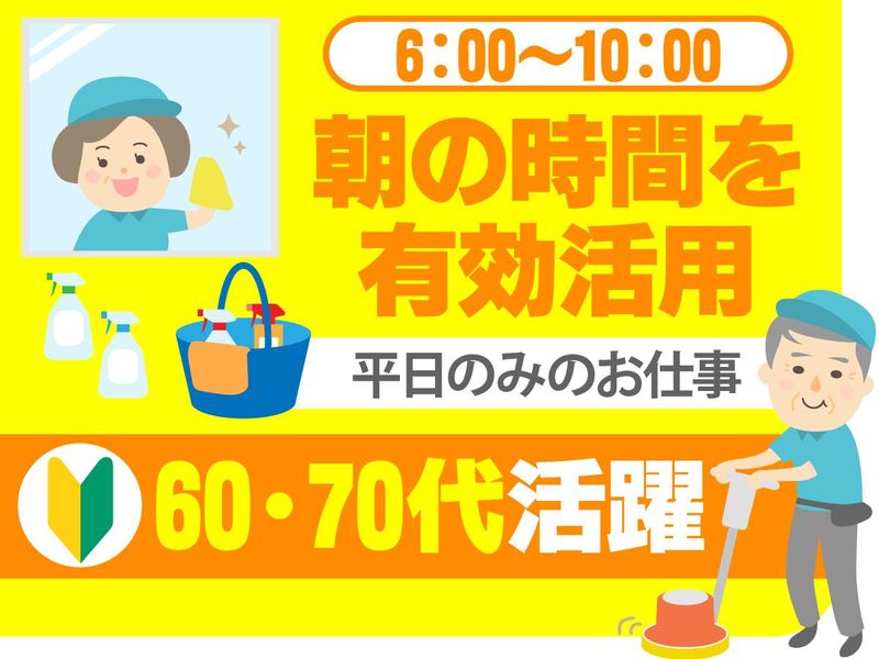 求めている人材 ■50代~70代男女活躍中! <学歴不問!経験不問!> 未経験・ブランクがある方も大歓迎♪ <こんな方に> ★お掃除が好き・キレイ好き ★コツコツ作業が得意 ★年金のプラスに扶養内で働きたい ★早朝のスキマ時間を有効活用したい ★平日のみでご家族とお休みを合わせたい ★家事と両立して働きたい ★Wワークで掛け持ちアルバイト