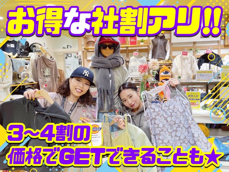 【保険制度】 雇用保険、労災保険、健康保険、厚生年金 待遇・福利厚生 【福利厚生】 昇給有 交通費規定支給 各種社会保険完備 ◆制服あり ⇒上のみ・その他は自由! ◆正社員登用あり ⇒年1回正社員試験あり ◆社員割引あり ⇒有名ブランドもお得にGET! ◆副業OK・WワークOK