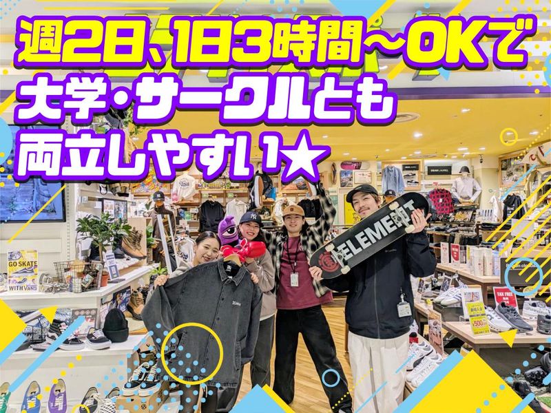 求めている人材 未経験者歓迎 学生・フリーター活躍中! \こんな方にピッタリ!?/ ★ファッションやスポーツが好きな方 ★お客様と楽しくお話しするのが好きな方 ★オシャレを楽しみながら働きたい方 (髪色・ピアス・ネイルOK) ★週2日~OK、1日3時間~OKなので 学校やプライベートと両立したい学生さんも大歓迎! ★未経験OK! 最初は簡単な品出しからスタートするので安心 ★実務経験によっては 時給1200円スタートも可能! ・接客販売サービス業で仕入れの経験者 ・スノーボード・スケートボードの専門知識をお持ちの方 など