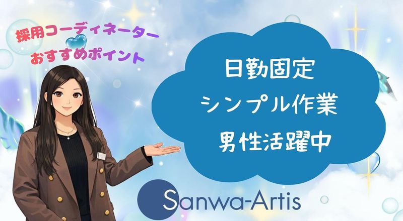 仕事内容 あなたのライフスタイルにあわせた お仕事みつけませんか 【求人コーディネーターよりごあいさつ】 サンワの求人をご覧いただき、ありがとうございます。 私たちは『共に学び、共に生長する』という企業理念のもと、すべての方により添うことを大切にしています。 本日は最後までみていただけるとうれしいです。 【採用コーディネーターより】 ✅高時給 ✅日勤のみ ✅長期休暇あり ✅シンプル作業 ■お仕事内容―――――――――――■■ 部品と部品をくっつけるための 機械操作をお願いしてます(^^)/ ⏩部品を機械にセット ⏩ボタンをポチッと押す ⏩くっついたらつるつるに削る ⏩指定の場所へ並べる こちらの繰り返し作業になります!! 入社後は先輩スタッフが優しく丁寧に 教えてくれるので、未経験者さんも安心(^^♪ 「お仕事が気になるッ!」 「実際に職場の中を見てみたい!」 など、気になる点や不安な点がありましたら 私たちと一緒に職場の中を見に行きましょう! お気軽にご相談ください♪ ✨20~50代男女活躍中