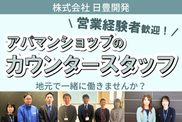 仕事情報 ● 仕事内容 お客様の人生の節目において、新生活の基盤となる最適な「住まい」をご提案するお仕事です。物件のご案内など外回りもありますが、店舗内での業務も多く、完全反響型の営業スタイルです。お客様にご満足いただける物件をご紹介し、信頼と感謝をいただいたときの達成感はひとしおです。ぜひ、仲間に加わりませんか? 人それぞれの『やりがい』 カウンター営業のやりがいは、なんと言ってもお客様やオーナー様から「お任せして本当に良かった」と感謝の言葉を頂いたとき。お客様から信頼を頂き大きな決断のお手伝いをし感謝されることは、大きなやりがいです。また個人ではなくチームで助け合いながら仕事をするので、皆で目標を達成する喜びも味わうことが出来ます。 日豊開発の働きやすさ 当社では、ここ数年で特に、社員一人ひとりが活き活きと働ける環境づくりに力を入れています。社員のキャリアアップのサポート体制を整え、長期的に活躍できる環境を提供しています。 チームで仕事を進めており、分からないことがあればメンバーに相談しながら、お客様に喜んでいただけるサービス提供をしています。 あなたの経験が活かせます この求人は、営業・販売・接客経験者の方向けの優遇条件です。不動産業界が未経験でも、今まで培ってこられたコミュニケーション力や提案力、人間力を活かしてご活躍いただけることを期待しております。あなたの強みを最大限に発揮して、不動産業界で新たなキャリアを築きませんか? 多くのお客様がご来店中! 当社は「賃貸住宅仲介店舗数No.1」の、アパマンショップに加盟。圧倒的なブランド認知度と、地域に根差した当社の営業活動も相まって、日々多くのお客様にご来店、ご契約いただいております。多くの契約に携わりますが、1人1人のお客様に真摯に、そして心を込めて向き合って、業務を行っています。