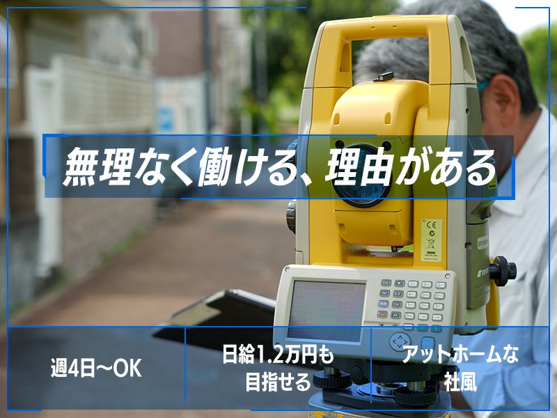 仕事内容 ・-・-・-・-・-・-・-・-・ 【完全週休2日制×土日祝休み】 週4日以上の安定勤務! プライベートとの両立も万全 ・-・-・-・-・-・-・-・-・ 《 働きやすさのワケは? 》 ✅週4日~OK ✅日給1.2万円も可能 ✅寸志支給実績あり ✅資格合格祝い金あり 【仕事内容】 不動産会社や住宅会社、 個人の地主の方、東京都や立川市等から 依頼された土地の測量を行います。 <1日の現場数> 基本的に1日1現場 ※作業量が少ない場合は 午前/午後で1日2現場の場合もあり ※1つの現場に2~3名で対応 <現場エリア> 東京都(主に多摩エリア) ※会社から現場への移動は社用車を使用 ※遠方の場合前日に連絡あり ※まれに出張あり <教育体制> 未経験の方や経験が浅い方は、 入社後はまず先輩と一緒に現場へ行き、 OJTを通して「測量」を身につけます。 二人一組で行動するため、わからない ことはすぐに質問できますよ。 測量士補や測量士、土地家屋調査士などの 資格取得への挑戦も全面的に応援します!