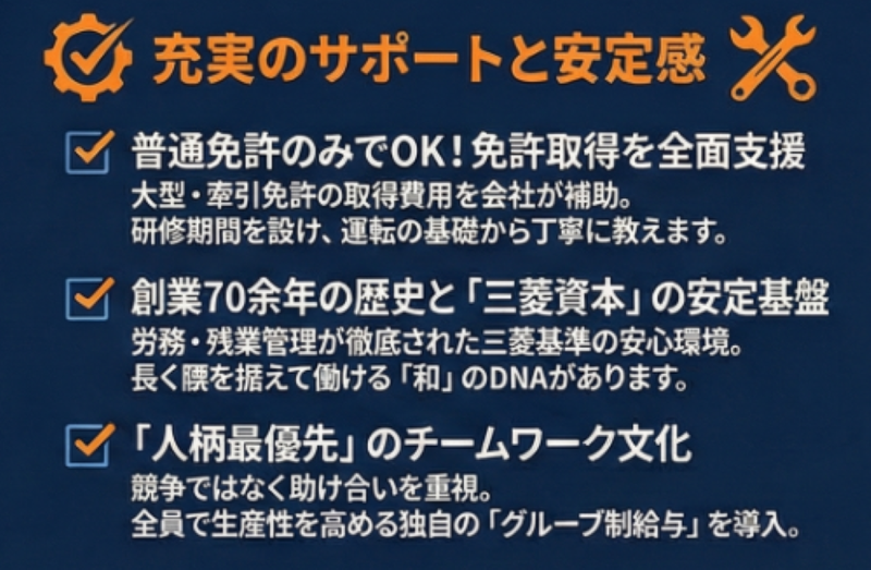 求める人材: 【必須要件】 ・大型自動車免許1種 けん引免許(無くても応募の相談可) 【こんな方を歓迎します】 * 大型免許・けん引免許をお持ちの方 * キャリアカードライバーの仕事に興味がある方 * 長距離運行ではなく、地場・固定ルートで働きたい方 * 安定した環境で、腰を据えて長く働きたい方 経験・学歴は問いません * 経験者歓迎 * 未経験者歓迎 * ブランクOK * 既卒歓迎 * フリーター歓迎 * U・Iターン歓迎 * 転職回数不問 * 職場見学可 40代以上も応募可 ※先輩ドライバーが同乗し、独り立ちまで丁寧にサポートします。 こんな想いの方にピッタリ * 夜勤・交代制でも、収入と安定を重視したい * 無理な長距離運行や泊まり勤務を避けたい * 大手メーカー関連の仕事で、安心して働きたい