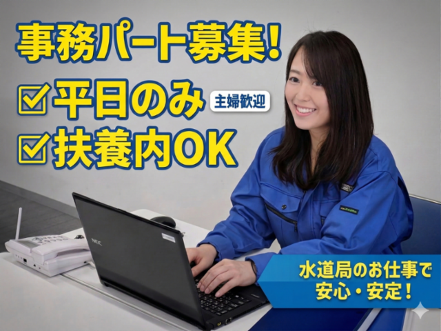 仕事情報 ● 仕事内容 事務所内で、伝票整理、電話応対、簡単なPC入力といった一般事務を担当していただきます。専用システムや定型フォーマットへの入力が中心のため高度なスキルは不要です。事務未経験やブランクのある方も大歓迎です。 公共のお仕事(水道関連業務)に携わるため、景気に左右されず安心して長く働けるのが魅力です。 家庭との両立が可能 土日祝日がお休みのため、ご家族やご友人との予定を合わせやすい環境です。月の出勤日数は10日程度。平日にもお休みがあり、心身ともに余裕を持った働き方が可能です。シフトを調整して年収103万円の扶養内に収めることができますので、近隣にお住まいの主婦(夫)の方に最適なアルバイトです。 簡単な電話対応・PC作業 伝票整理、電話応対、簡単なPC入力作業などをお任せします。特別なスキルは不要で、基本的なPCの文字入力ができれば大丈夫です。分からないことがあれば、先輩スタッフが丁寧にサポートします。ブランクがある方も安心してご応募ください。 会社情報 株式会社宅配は、水道事業体のパートナーとして、水道工 事にともなう断・濁水のお知らせの配布から事業をスタート。現 在は窓口・収納業務、メーター検針業務、開閉栓業務、未納金整 理業務などを通じ、各自治体の住民の皆さまと水道事業体を結ぶ サービスを提供している企業です。