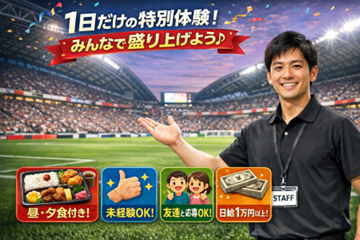 仕事内容 \人気の国立バイト!レアな1日限定案件/ 清水エスパルス運営スタッフ大募集! ✨5/24(日)限定!単発バイト ✨一日だけで【1万円以上GET可能】! ✨勤務終了後の日払いOK(事前申請制) ✨非日常のスタジアム体験ができるレア案件 \友達同士の応募も大歓迎!/ みんなでワイワイ楽しく働こう♪ ━━━━━━━━━━━━━━━━━━ <お仕事内容> Jリーグ試合の運営サポートです! ・入場ゲート対応: チケットやQRコードのチェック ・スタンド対応: 観客の案内・安全確認 ・場内対応: ピッチ内や関係者エリアのサポートなど ⭐難しい作業なし! 案内・誘導などシンプル業務中心 当日はチームで動くので安心! <勤務詳細> ■イベント:Jリーグ試合 清水エスパルス vs ガンバ大阪 ■会場:MUFG国立競技場 (東京都新宿区霞ヶ丘町10-1) ■時間:10:30~21:00(予定) ■給与:時給1300円(実労働時間分支給/休憩あり) ■アクセス:現地集合・現地解散 ━━━━━━━━━━━━━━━━━━ <嬉しいポイント!> ✅ 昼・夕食付き! ✅ 未経験OK(サポート充実) ✅ 単発OK・副業OK ✅ 学生・フリーター・社会人歓迎 ✅ シニアも活躍中! <こんな方におすすめ!> ✔ 単発でサクッと稼ぎたい ✔ スポーツイベントに関わりたい ✔ 普段できない体験がしたい ✔ 友達と一緒に働きたい ✔ 1日でしっかり稼ぎたい方にピッタリ! 「ちょっと気になる」でも応募OK! 一日限りの特別体験を、国立で。 みんなで試合を盛り上げよう!! ━━━━━━━━━━━━━━━━━━ <服装・持ち物> 【服装】 ・黒の10分丈ズボン ・華美でないスニーカー ※スタッフポロシャツ貸与あり ※インナーで温度調整OK(黒ロンT可) 【持ち物】 ・ドリンク ・腕時計 ・筆記用具 ━━━━━━━━━━━━━━━━━━ <当日スケジュール(予定)> ・10:00 スタッフ集合・点呼 ・10:30 業務開始(レクチャー含む) ・11:00 ポジション配置レクチャー ・12:15 ポジション配置完了 ・13:00 開場 ・17:00 キックオフ ・19:30 撤去開始 ・21:00 業務終了 ※試合の状況により変動あり ━━━━━━━━━━━━━━━━━━