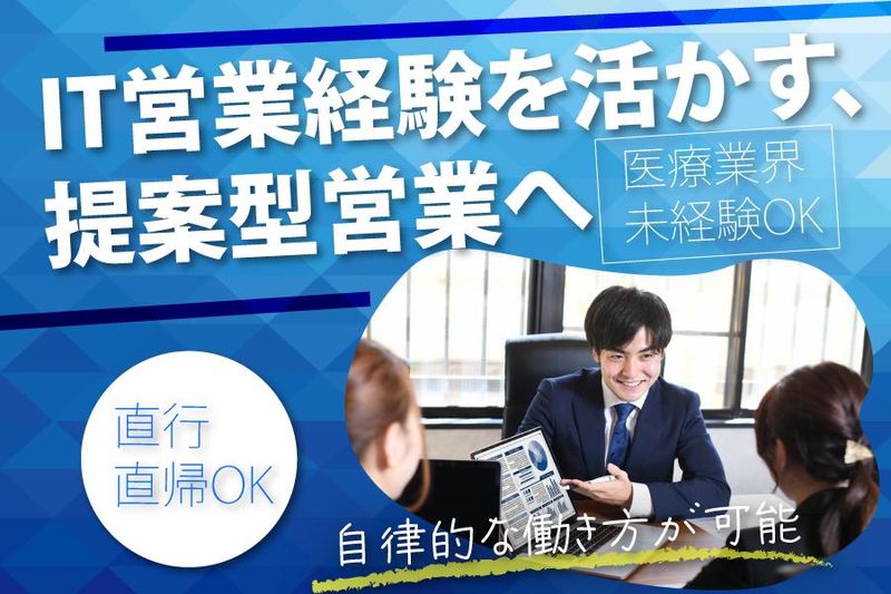 求めている人材 <必須条件> ・法人営業の経験がある方(経験年数不問) ・医療業界・IT業界未経験の方もOK \20代~30代の方活躍中!/ <歓迎条件> ・医療業界について知識がある方 ・無形商材の営業経験がある方 ・普通自動車第一種運転免許(AT限定可)