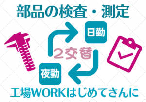 仕事内容 部品の測定・検品のお仕事です。 自動車シートに使う部品です。 ・ノギスを使って測定 使い方はかんたん!ひとつの部品につき10箇所ほど測定します ・サビ・キズ・バリのチェック 機械で製造しているので、ほとんど不具合はありません。 製造機械もある工場内で、テーブル上でチェック作業をしていきます。 基本的に一人で行うので、モクモクと集中した作業が好きな方におすすめ!
