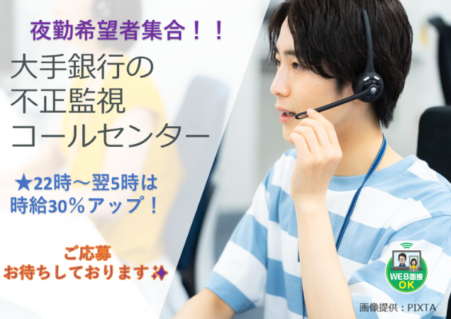 【★夜勤のお仕事です★土曜日は公休!】週4日~勤務OK!大手銀行の不正監視コールセンター【札幌駅】