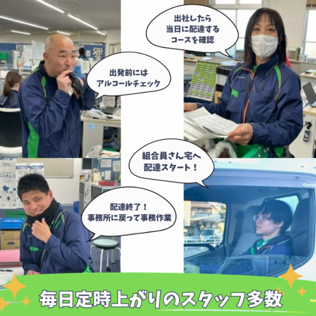 仕事情報 ● 仕事内容 食品や日用品など宅配する生協(コープ)個人宅配ドライバー。 朝、倉庫で荷物を積み込み、組合員さま宅へ配送します。運転中 は安全に集中し、宅配先では組合員さまとの適度なコミュニケー ションを楽しみ、メリハリよく働けます。小型トラックなので 普通免許があればOK!再配達・長距離運転なし!地場配送のみ! 未経験でも安心 入社後、2ヵ月の研修があります。流通サービスのことから生協 (コープ)の仕事内容についても順番に覚えていけるので、未経 験の方も安心してご応募ください。また、丁寧に研修を行うの で、経験の浅い方やブランクのある方もスムーズにお仕事に慣れ ていけます。2ヵ月後には立派な【流通サービス】の一員です! 家族がいるスタッフ多数! 今までシフト制で土日休めなかった。残業があって夕食を一緒に食べれなかった。などの理由で弊社へ転職を決めた方多数!実際働いている人たちは配送後、事務作業が終わったらすぐ帰宅など安定して働けています。 この仕事のやりがい ご高齢の組合員さまに配達する際の「見守り活動」なども、 地域への安全・安心、社会貢献につながっています。 担当ドライバーとして幸せな瞬間は顔なじみの組合員さまからの 「いつもありがとう」のお言葉。この仕事を通じて、誰かの役に 立てている、そんなことを実感できます。 大手物流グループ 安定・安心の職場の先に、成長がある。 物流の未来を創るロジスティードグループの一員として、 9,000億円規模の事業を支える確かな基盤と、挑戦を後押しする環境があります。 全国で5万6,000名の仲間が、それぞれの「成長ストーリー」を描いています。 安心できる職場で、自分らしいキャリアを築きませんか?