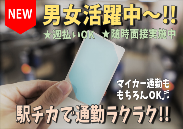 募集要項 職種 部品の仕分け・ピッキング・検査業務 雇用形態 派遣社員 仕事内容 . * 仕事内容*  ̄ ̄ ̄ ̄ ̄ ̄ ̄ 入荷した部品を端末機でバーコードを読み取り棚へ片付けたり、 必要な部品を棚から集めて、数をかぞえて箱へ梱包します。 *お仕事の流れ*  ̄ ̄ ̄ ̄ ̄ ̄ ̄ ̄ ●外部から入ってきた部品の受け入れ ●指定された部品を棚からピッキング ●製造部署への供給 ●不良品がないか目視チェック ただ、これだけです!! 作業はシンプルで難しい作業等はありません! \20~40代の男女活躍中/ 幅広く活躍していただける職場です! ライン作業ではありません!! 重量物もなく、女性の方も多く活躍されています♪ \環境バツグンの職場です/ キレイ&空調完備で快適! 食堂など、待遇面もバッチリ! 駅チカで通勤もラクラクです♪ \当社スタッフ多数活躍中の職場です/ 未経験の方でもスグに覚えていただけます! 不安なことは何でも相談しやすい環境です♪ .
