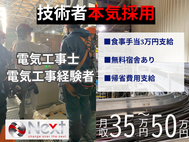仕事内容 ✅電気工事の技術者 電気工事士 日給1.7万~ 本気の採用で技術者確保を目指します! 高収入 / 好待遇 / 本気の採用で技術者確保を目指します! *大手メーカー様のお仕事で安心 *高収入 年収500万円以上可 *食事手当あり 月3万円支給 *宿舎希望者は単身寮あり *家賃光熱費 全額会社負担 *現場⇔自宅の直行直帰可 *有給休暇を自由に取得 - 会社と社員が共に成長し、 働きやすい職場環境をつくる事を目指しています! ⭐評価制度&賃金制度⭐ 3ヶ月に一度評価をおこなうので 半年に一度昇給のチャンスがあります! ⭐技術者の育成制度⭐ 必要資格の取得推進でスキルアップ! 取得費用は会社が全額負担! - ※従事現場:東海原子力発電所 ※単身寮あり:光熱費含めすべて会社負担 ※いわき市から通う場合は社用車で通勤可 - 【株式会社Nextについて】 創業18年総合建設業として 東北~関東エリアの幅広いエリアで 様々な工事のご依頼に対応しています! - 原子力発電所等プラント関連工事2次会社 - 土木工事において準ゼネコンの1次会社 - 【仕事内容】 *盤搬入・設置作業 *サポート加工・設置 *電線管 加工・設置 *ケーブル布設 *ケーブル端末処理・接続 ※電線管の加工経験がある方優遇 ※ケーブル端末処理・接続の経験がある方優遇 - 【対象となる方】 ⭐電気工事士として待遇を改善したい方 歓迎 ⭐ ✅「第一種電気工事士」 保有の場合はさらに条件交渉あり!! - 第二種電気工事士以上(必須) - 普通自動車免許(必須) - 資格保有者で収入をあげたい方 - 電気工事の現場経験2年以上ある方 - 原発構内での作業経験者はさらに優遇! - 着任していただく現場では 20代から50代の社員が活躍しています! 役割としては、チームの技術的な底上げや 経験が浅い20代~30代の社員への 指導的な指南などを期待しています! - 【給与】 日給:17,000円~20,000円 ※経験、能力、資格を勘案して日給を決定します ✅「第一種電気工事士」 保有の場合はさらに条件交渉あり!! ▼実績ポイント 繁忙期では残業・土曜出勤あり 50万~60万の給与支給多々あり! ▼賞与 年1回 8月支給 (会社業績による) 前年度支給実績あり - 【勤務時間】 勤務時間:8:00~17:00 休憩時間:1時間 【休日・休暇】 日曜・祝日 (現場スケジュールにより変更あり) 有給休暇、夏季休暇、冬期休暇、GWなど ※月の稼働日数は22日程度 【勤務地について】 茨城県 東海原子力発電所 従事期間:2年程度を予定 【本社】 福島県いわき市小名浜相子島字石田43-1 ※現場へ直行直帰になります - 【待遇・福利厚生】 各種保険完備 ユニフォーム支給 マイカー通勤可能(直行直帰) 資格手当(5,000円~10,000円) 【制度】 有給休暇制度 資格取得支援制度(全額会社負担) 賞与(年1回 8月支給 会社業績による) 通勤車両レンタル可(10000円/1ヶ月) - 会社と社員が共に成長し、 働きやすい職場環境をつくる事を目指しています! ⭐評価制度&賃金制度⭐ 3ヶ月に一度評価をおこなうので 半年に一度昇給のチャンスがあります! ⭐技術者の育成制度⭐ 必要資格の取得推進でスキルアップ! 取得費用は会社が全額負担! - 【検索キーワード】 電気工事/第一種電気工事士/第二種電気工事士/東海原発/現場作業/原発/福島原発/福島第一原発/1F/社宅あり/ボーナスあり/単身赴任/高収入/正社員/学歴不問/住み込み/資格取得支援/手に職/力仕事/中高年活躍中