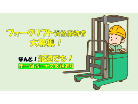 お仕事内容 <フォークリフト作業員採用強化中><積極採用中> ◆工場内(倉庫内)でのフォークリフト(リーチ式)作業を行っていただきます。 ◎作業ラインへの供給 検査・加工前の部品及び製品の入ったラックを作業ラインへリフトを使って運んでいただきます。 ◎完成品集荷 検査・加工が終わった部品及び製品のラックを保管場所への移動及び、出荷場所への運び出しをしていただきます。 POINT①事前に見学ができるので実際の環境や作業内容を見てから入社を検討していただいてOK! POINT②数人の先輩リフト作業員がおられるので安心!