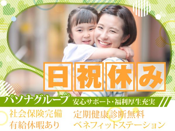 【保険制度】 雇用保険、労災保険、健康保険、厚生年金 待遇 「パソナグループ」の関連会社だからできる 業界トップクラスの安心サポート! ★福利厚生充実★ ■社会保険・労災完備 ■有給休暇 ■交通費支給 ■定期健康診断無料 ■インフルエンザ予防接種補助 ■バースディプレゼント ■年末年始手当 ★嬉しい特典★ □ベネフィットステーションが使える! レジャー・グルメなど割引♪ □資格取得支援キャンペーン! 受講料全額キャッシュバック♪ ※詳細はお問合せください。